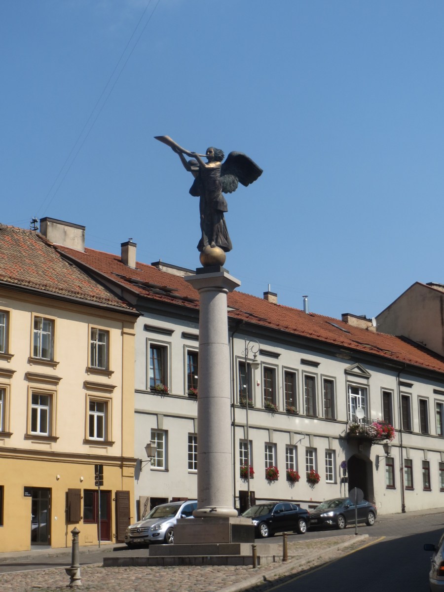 Taiteen vapautta kuvaava toitottava enkeli. Aiemmin enkelin tilalla tolpan päällä oli jättikokoinen muna.