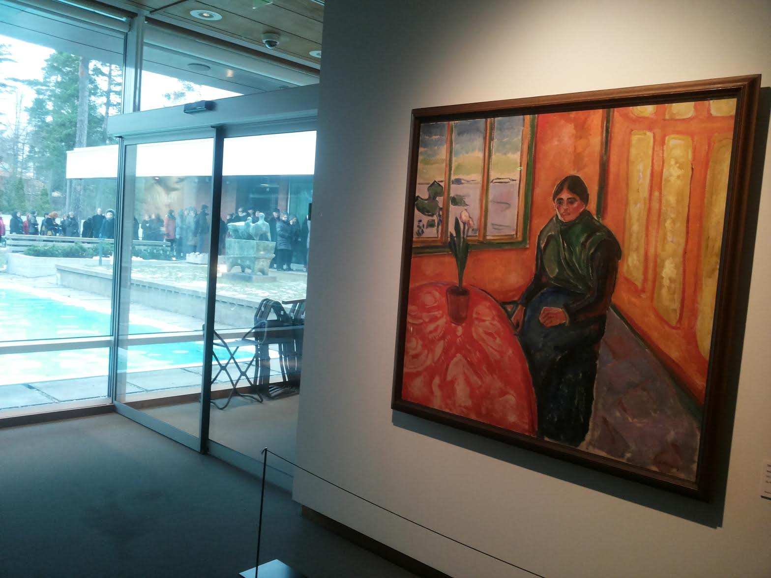 Oslon-matkallani pari vuotta sitten nautiskelin Munchin maalauksilla. Niistä on näyttelyssä joitain grafiikkaversioita. Minua liikuttanut maalaus Puberteetti on tekniikan myötä vaihtanut myös nimeä, sillä hentoinen tyttöhahmo istuu avuttomana sängyllä nyt pienessä etsauksessa nimeltä Yöllä. Näyttelyssä on muutakin hienoa grafiikkaa, esimerkiksi yksi vedos kuuluisasta Huudosta. Sen vierelle on präntätty taiteilijan runokuvailu tilanteesta, josta Huuto kumpuaa, pohjoisen kesäyön värien ja valon vaivaamasta eksistenssiangstista.
