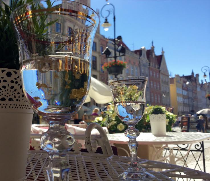 Näissä näkymissä kirjaa lukemassa, lasissa lukutunnelmaan sopivasti gdanskilainen erikoisuus: vodkapohjainen likööri lehtikultahippuineen.