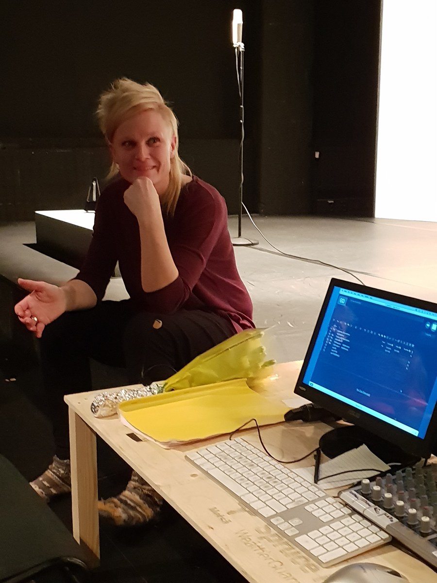 Heini Junkkaala Omapohjan lavan reunalla edessään työvälineet, joilla hän edesauttoi esityksen etenemistä.