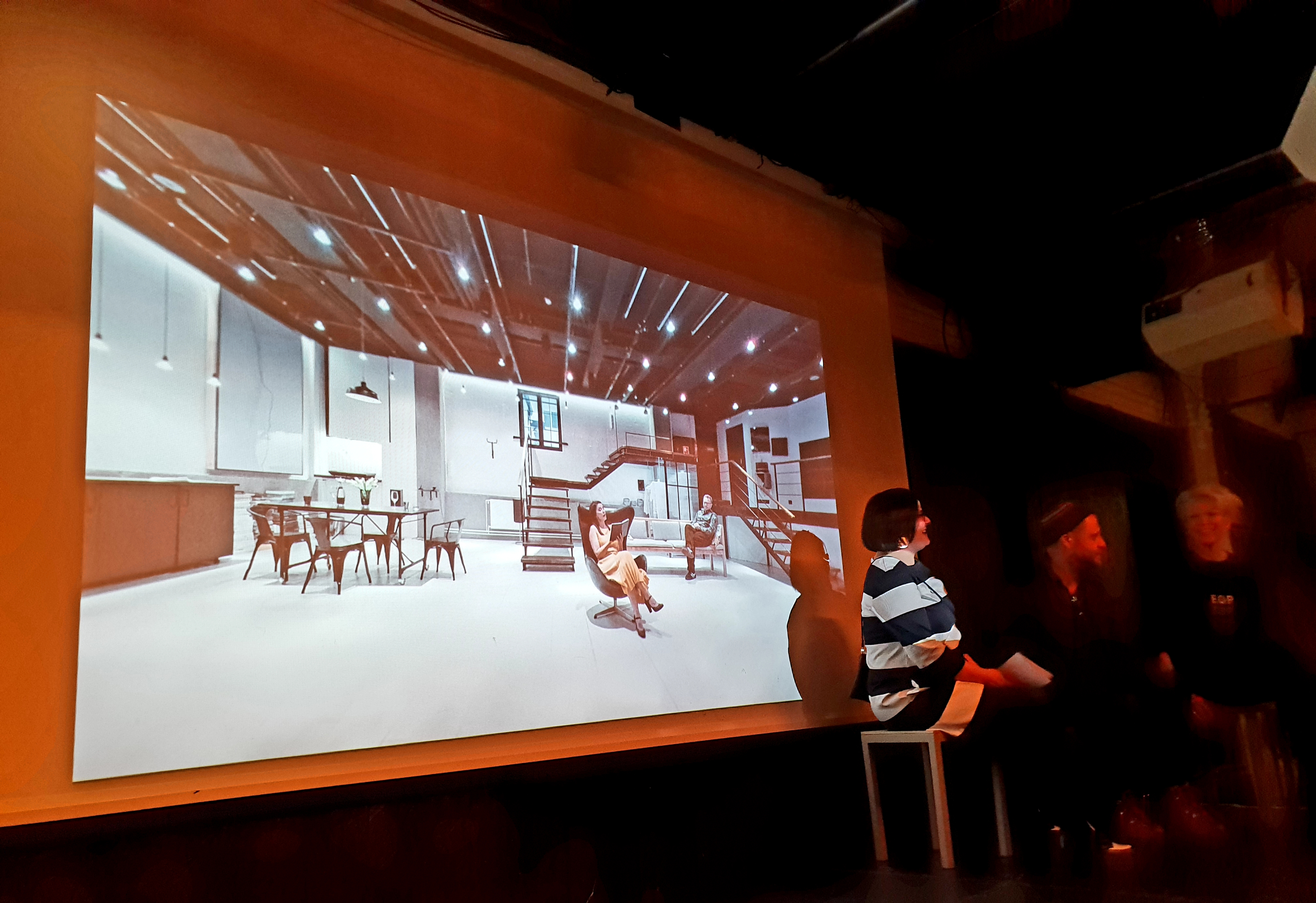 Ennen esitystä Bloggariklubilla Kirsi Helstelä (vasemmalla), Michael Baran ja Tarja Simone.