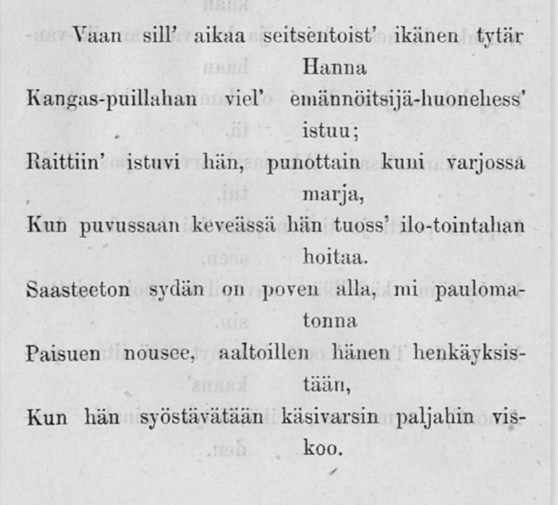 Runebergin Hanna on kirjoitettu alun perin ruotsiksi, ja valitsin kolmesta suomennoksesta vanhimman (Paavo Cajander 1880, muut: Otto Manninen 1940, Teivas Oksala 1993). Runoelmaksi tituleerattu teos on kirjoitettu eeposten heksametrimittaan. Heksametria ei olekaan helppo selittää, mutta kyse on kuusirytmisestä, loppusoinnuttomasta runokielestä. Kuvailevassa kielessä sanajärjestys ja sanasto nykysilmin ja -korvin poikkeavat totutusti. Malliksi kaappaan kuvan alkuteoksesta: