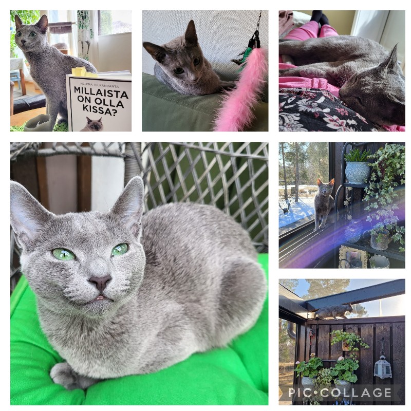 Peilailen kirjan antia kotioloihin. Tiivistän. Hyvillään kissa on silmät sirrillään, ja ilokseni Sohvi mielellään siristelee kanssani kirkkaanvihreitä silmiään. Kovin hanakka kotikissani ei ole sylissä leppostelemaan tai kehräilemään, mutta elämäniloa hän tarjoaa päivittäin. Utelias ja toimelias venäjänsininen neiti elää elämänsä ensimmäistä kevättä ja näyttää minullekin, miten aamu on aina uusi.