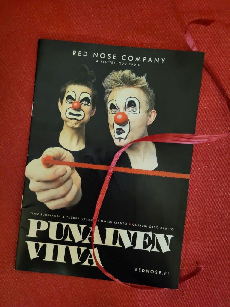 Punaista viivaa on esitetty yhdeksän vuotta, ja Kiannon romaani ilmestyi jo vuonna 1909. Tuoreelta tuntui. Tästä innoittuneena lähdemme teatteriseuralaiseni Johannan kanssa maaliskuussa Turkuun kokemaan Red Nose Companyn tulkinnan Aleksis Kivestä. Sitäkin on klovnipari esitettänyt monta vuotta.