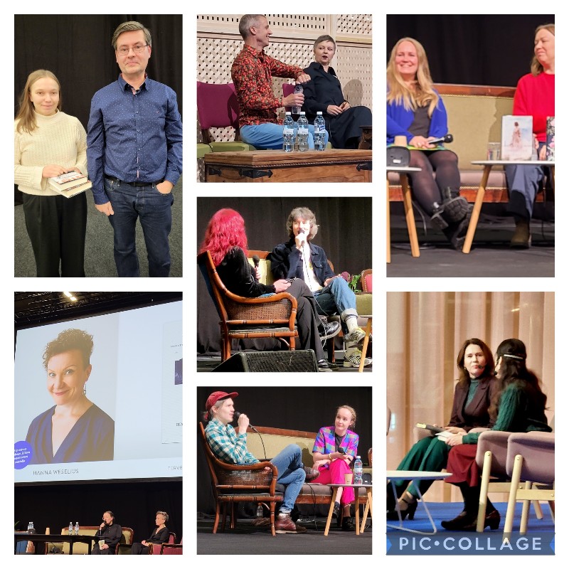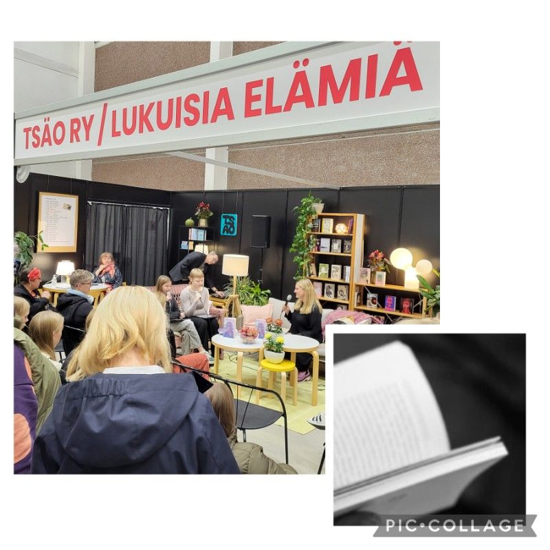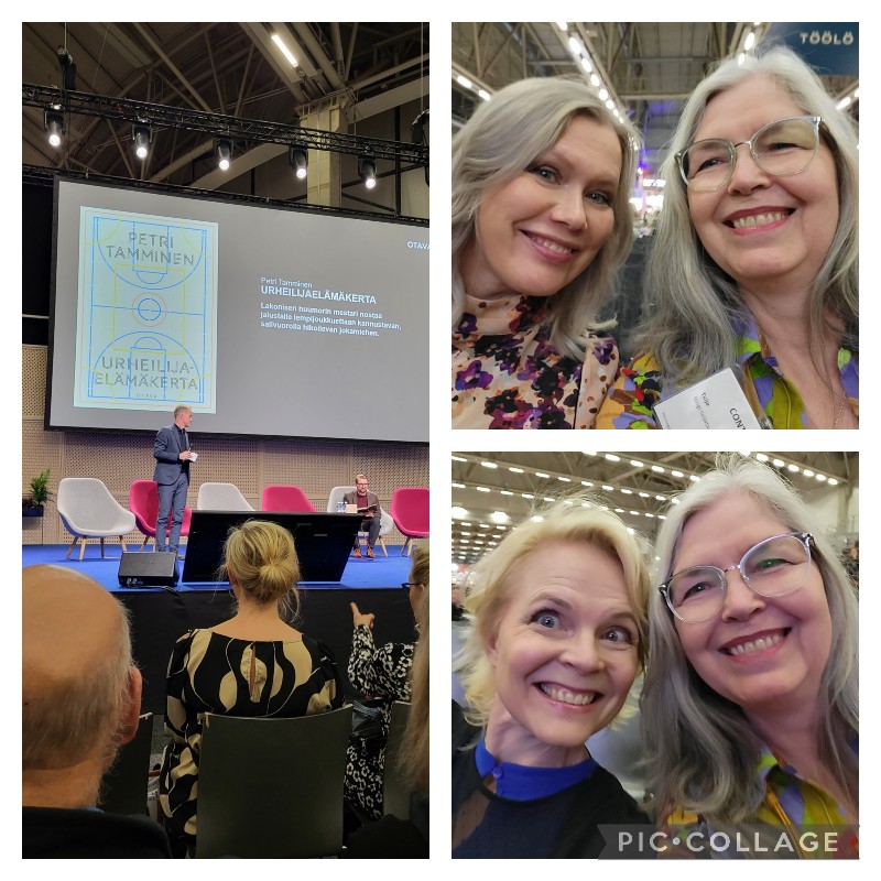 Lisäksi oli muita lukkuisia, kivoja kohtaamisia kirjasometuttujen kanssa. Perjantai-iltana olisi ollut monia kirjakekkereitä ja -kokkareita. Valitsin tapaamisen tuoreen yhdistyksen vapaamuotoisen jäsentapaamisen. Istuin hetken Selkokirjailijat ry:n messuille saapuneiden jäsenten seurassa.