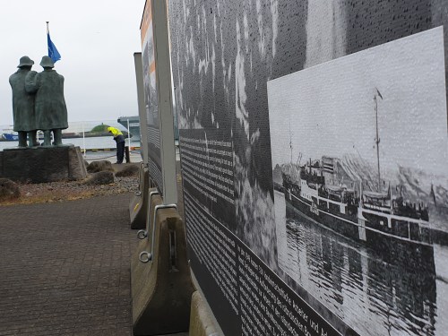 Kuvan oikeassa alareunassa on Esja-laiva, joka toi Petsamosta islantilaiset kotiin. Reykjavíkin satamassa on infotauluja historiallisista tapahtumista, tämä on niistä yksi.