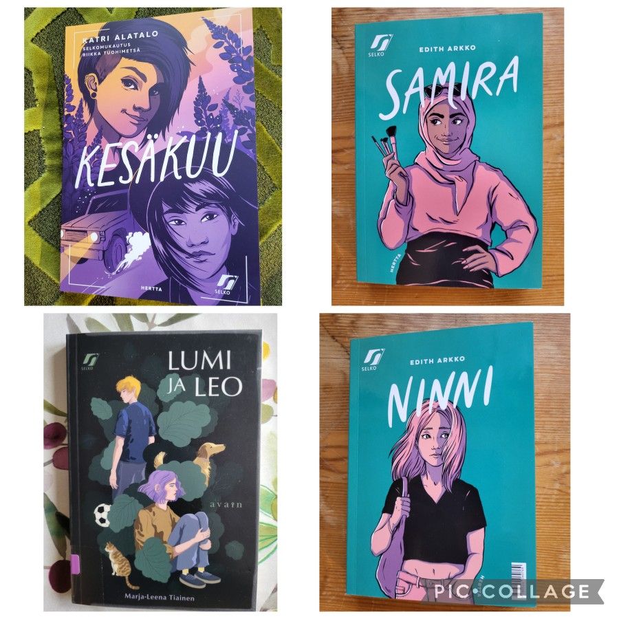 Kukin kirja käsittelee omaehtoisesti aiheitaan niin, että kirjat ovat täsmäiskuja etenkin ysiluokkalaisille. Koulu vaikuttaa nuorten elämään, joka on sakeanaan myös muuta pulmallista. Löydän kolmikkokirjasta myös omaa, uutta nuortenromaaniani viistävää: Vihreä on hyvä väri -selkokirjassa ysiluokkalainen pohtii ammattikoulun alavalintaa, ja se on myös teemana Arkon Samirassa. Tiaisen Lumi ja Leo esittelee sinitukkaisen tytön, kun taas oman romaanini Sara sekoittaa tavallisuuttaan vihreällä tukalla. Lumia ja Saraa yhdistää myös se, että he asuvat kaksin isänsä kanssa.