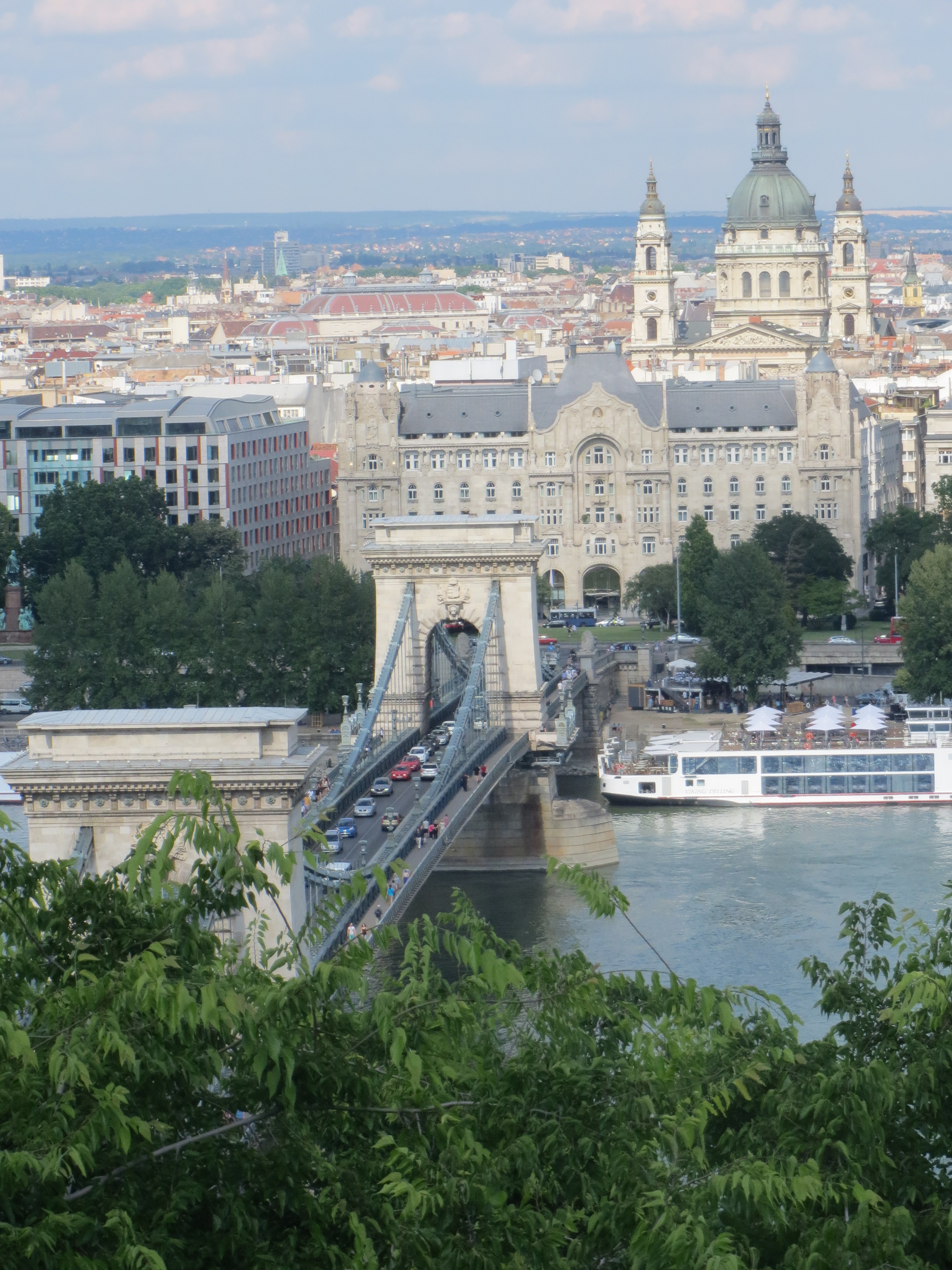 Turistin idyllinäkymä tänään Budan linnavuorelta Pestin puolelle, Ketjusilta on korjatussa kuosissa.