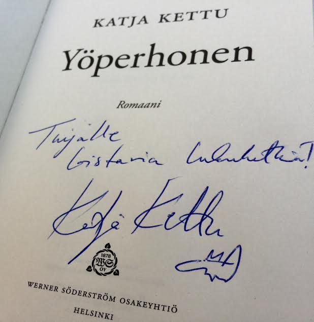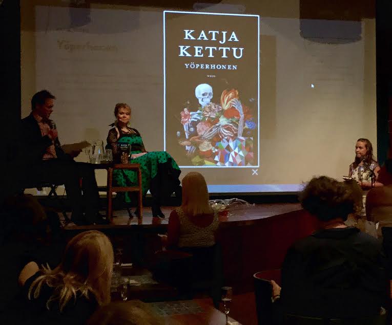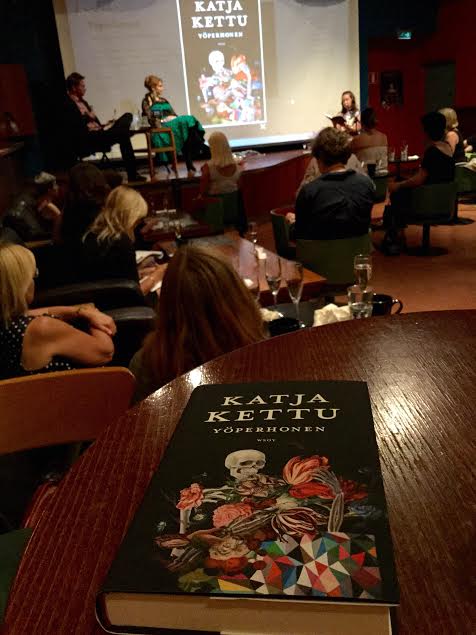 Lopuksi siteerasin romaanista: ”Kuulen kissan kehräävän. Ja ymmärrän, että se on romaanin hyrinää.” Katja Kettu kertoi, että romaanin kirjoittaminen oli hänelle ilo, ja kun teksti pääsi vauhtiin, sitä syntyi virtaavasti. Ja kyllä se hyrisikin – ja hyrisee.