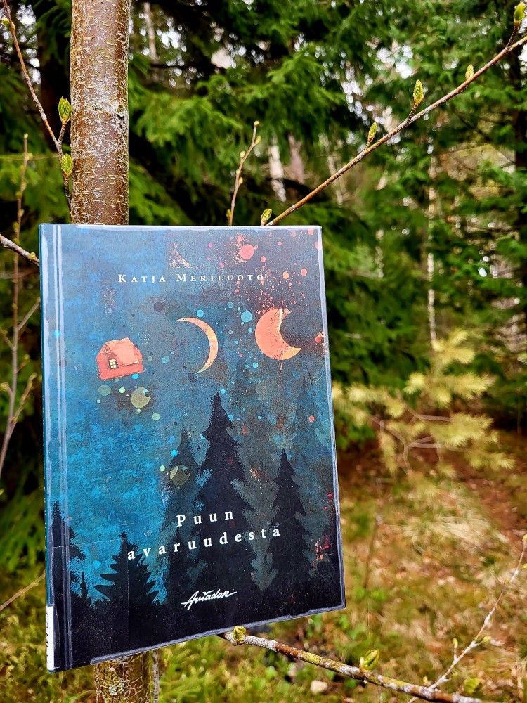 Katja Meriluoto: Puun avaruudesta, Aviador 2025, 69 sivua. Lainasin kirjastosta. (Ostan kyllä kirjan, sillä tätä kokoelman avaruutta ei voi muutamalla lukukerralla tyhjentää.)