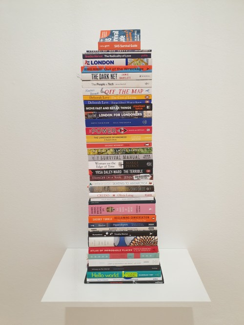 Minua puhuttelee eniten installaatiokokonaisuus 6 months without, jossa taiteilija dokumentoi nettipaussiaan. Näytillä on kirjeitä, muistilappuja, luettuja kirjoja ja lehtiä sekä selfiet jokaisesta päivästä. Taiteilija toteaa paussin vaikuttaneen vireään sosiaaliseen toimintaan.