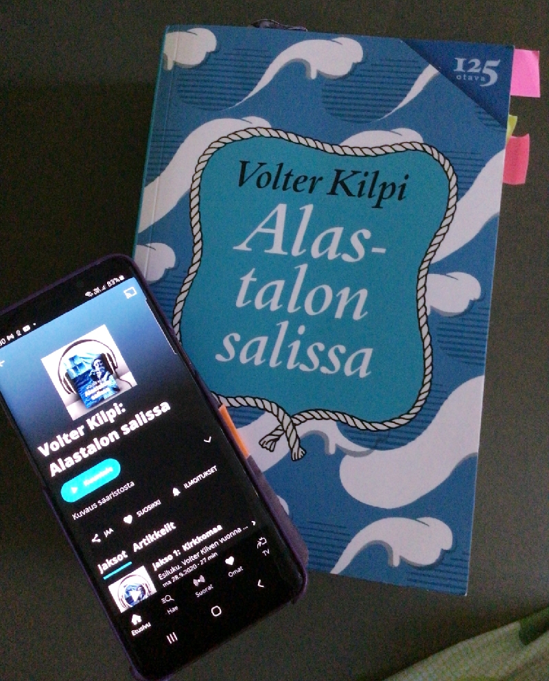 Aloitin Alastalon salissa helmikuussa, sillä kolmen hengen kirjapiirini otti sen pitkän tähtäimen ohjelmaan. Ensimmäiset viisi lukua luin kirjana, sitten vaihtelevasti luin ja kuuntelin kirjaa Yle Areenasta. Jostain olen saanut tietooni, että Kilpi itse piti tekstiään toimivana etenkin ääneen luettuna, ja Esko Salervon tapa pakista Kilven tekstiä vakuuttaa kirjailijan kannasta, sillä äänikirjana toteutus on taidokas.